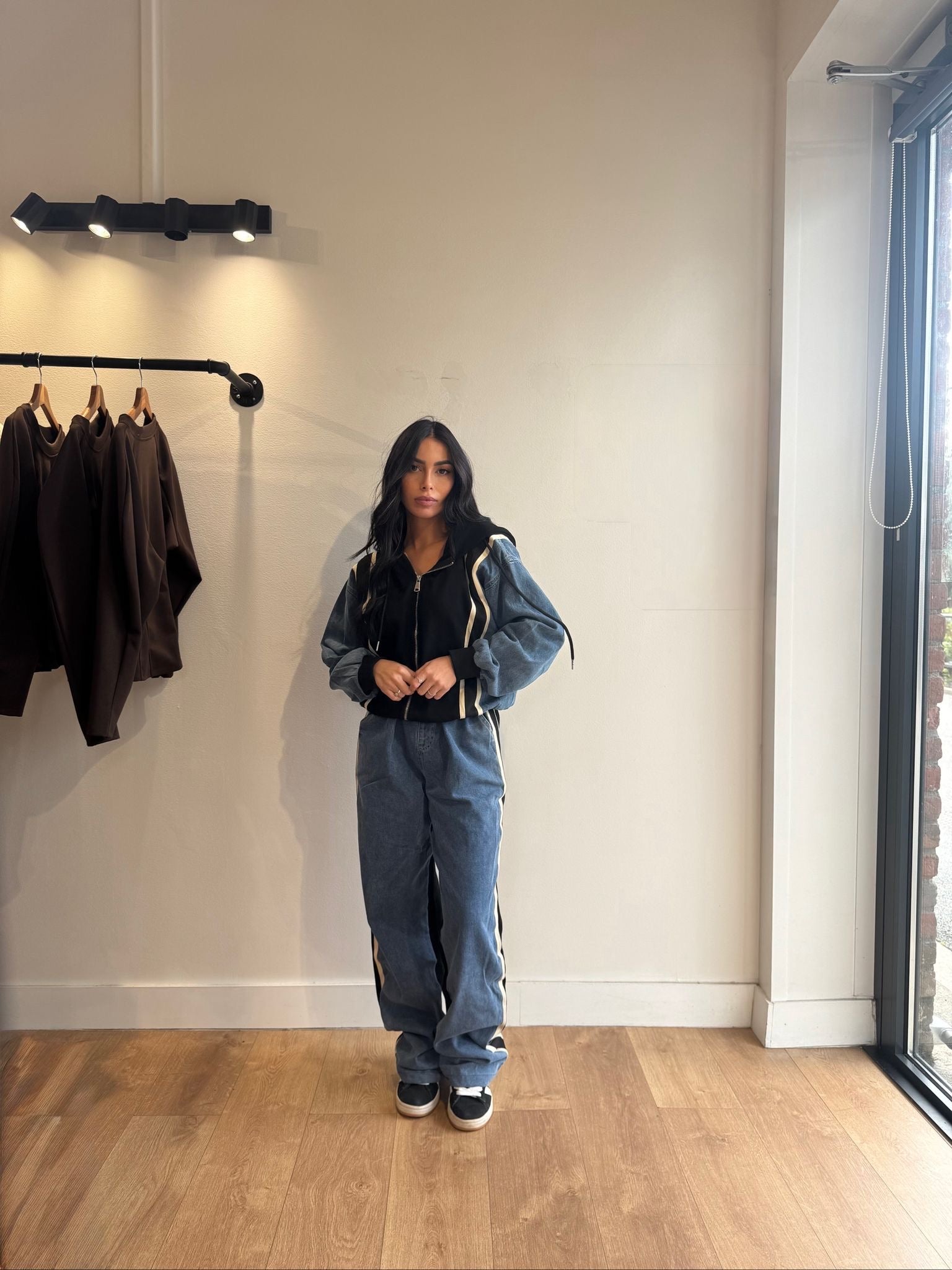 Ensemble bi matière , veste et pantalon ; taille grand ; le modele porte un 36 et mesure 1m56