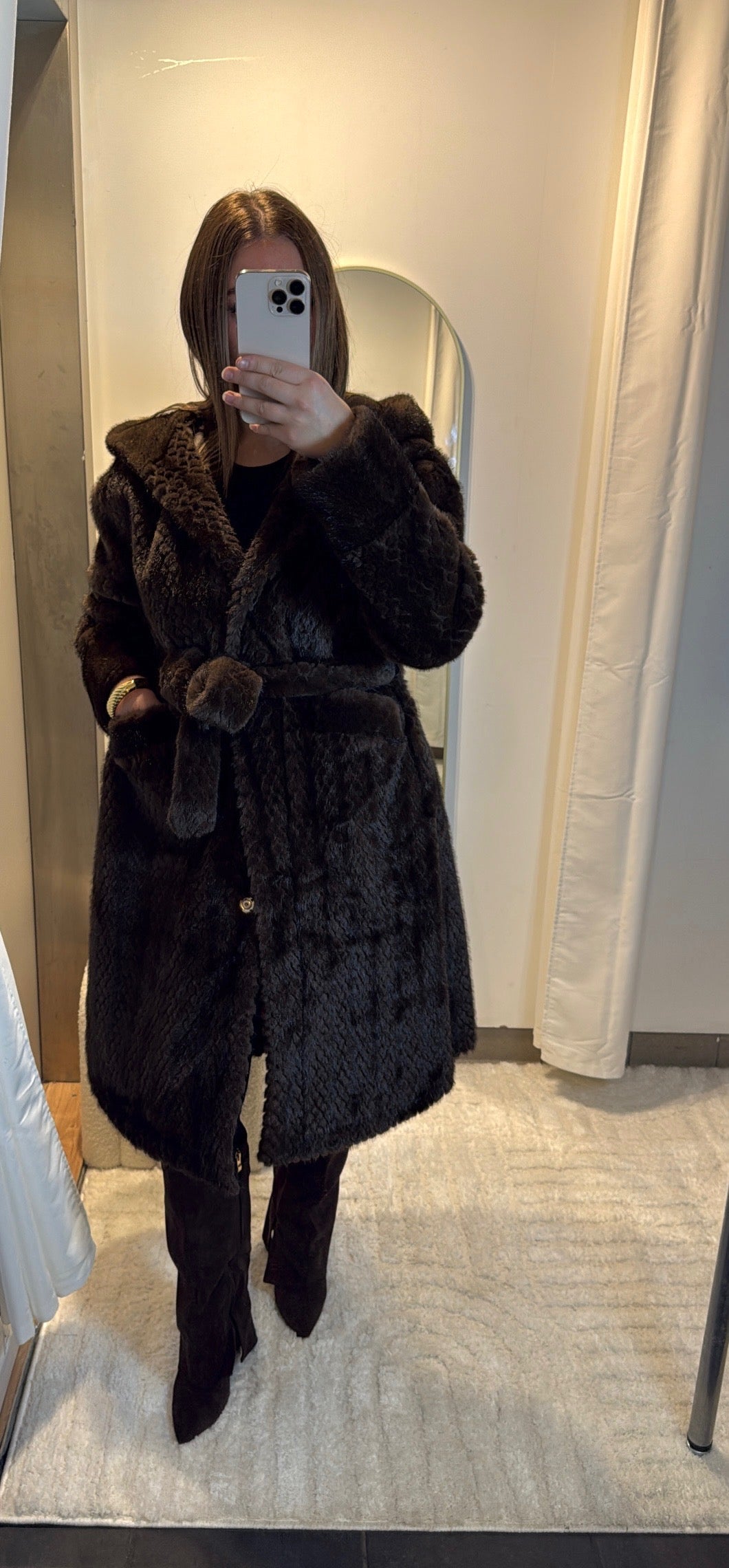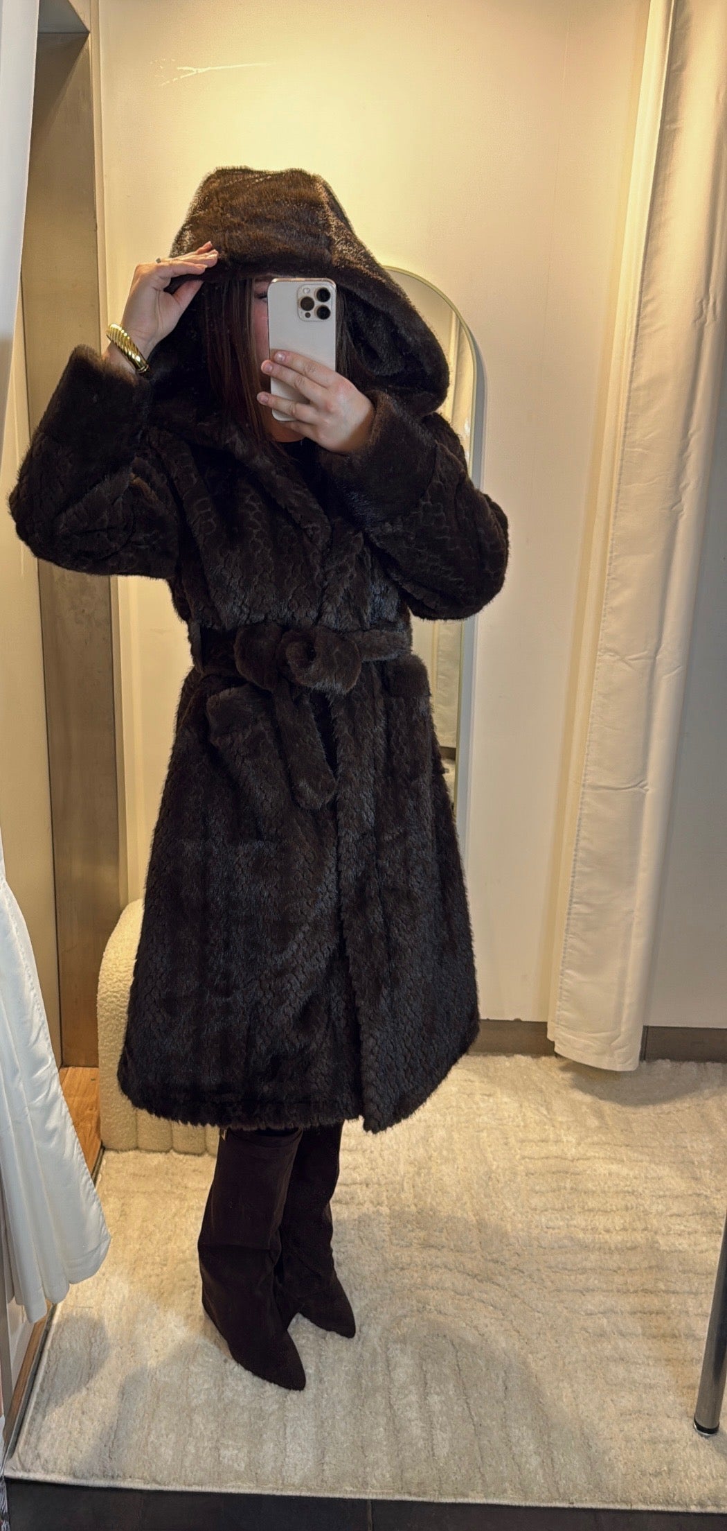 Longue fourrure vegan tressé, avec ceinture et capuche .