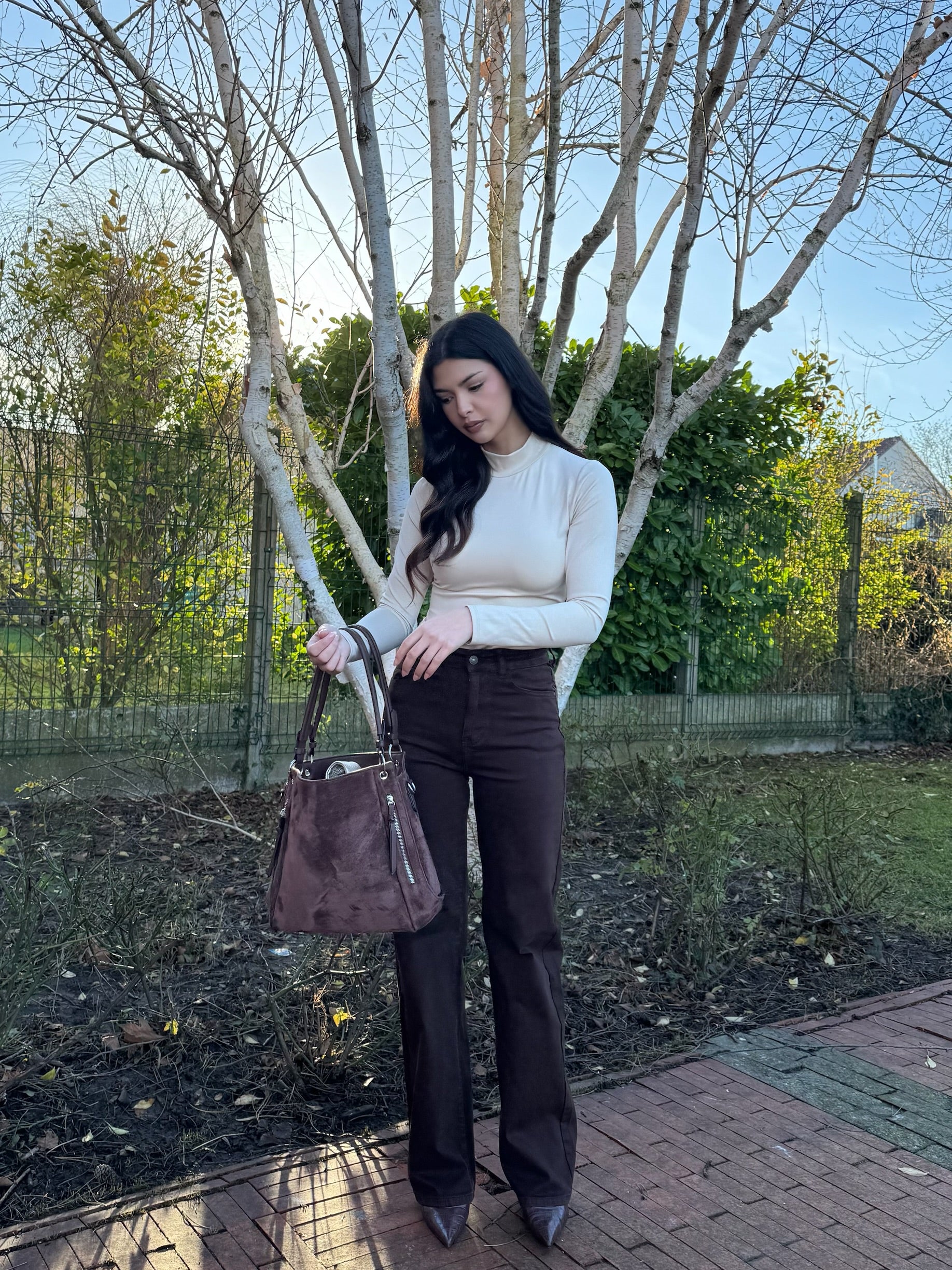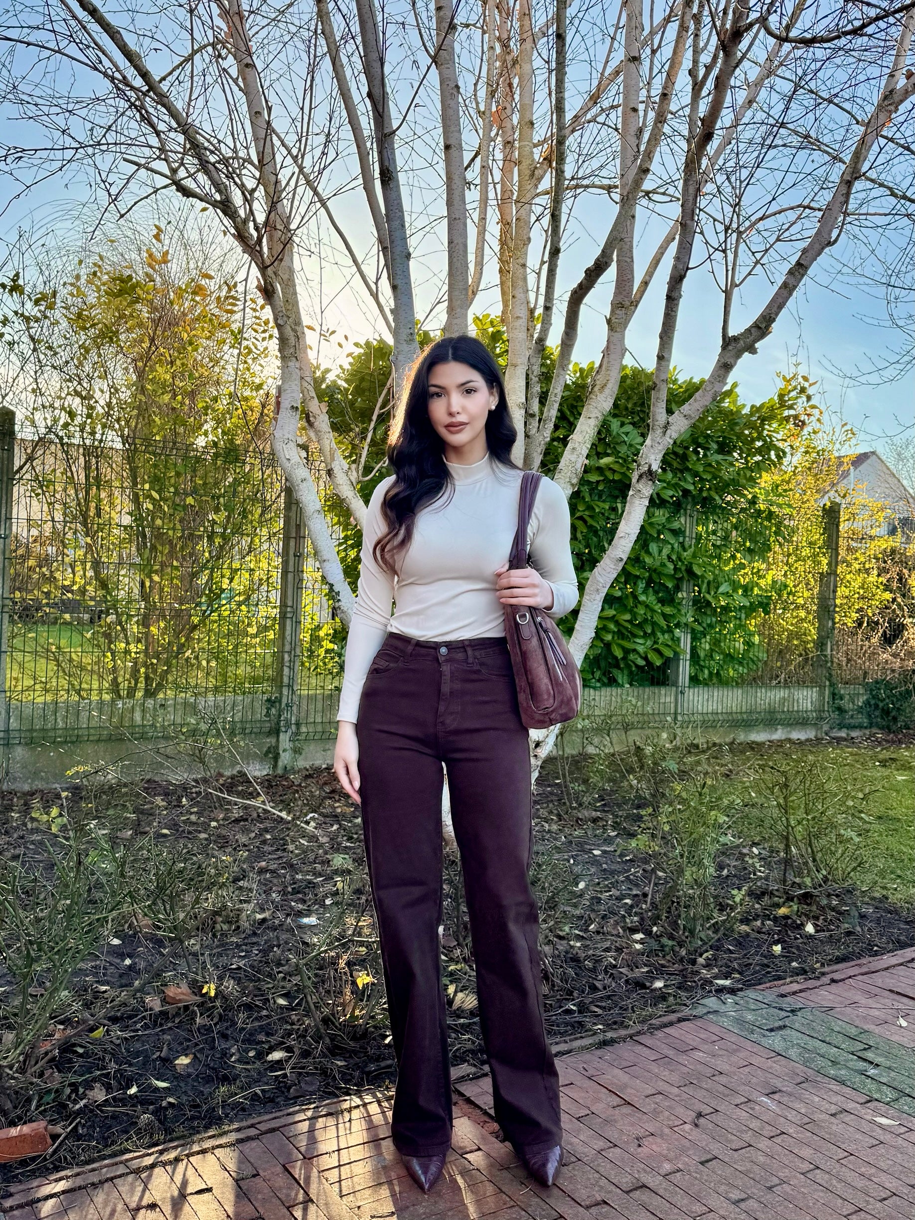 Jeans couleur marron chocolat, coupe wide leg . Le modèle porte un 34 et mesure 1 m 65