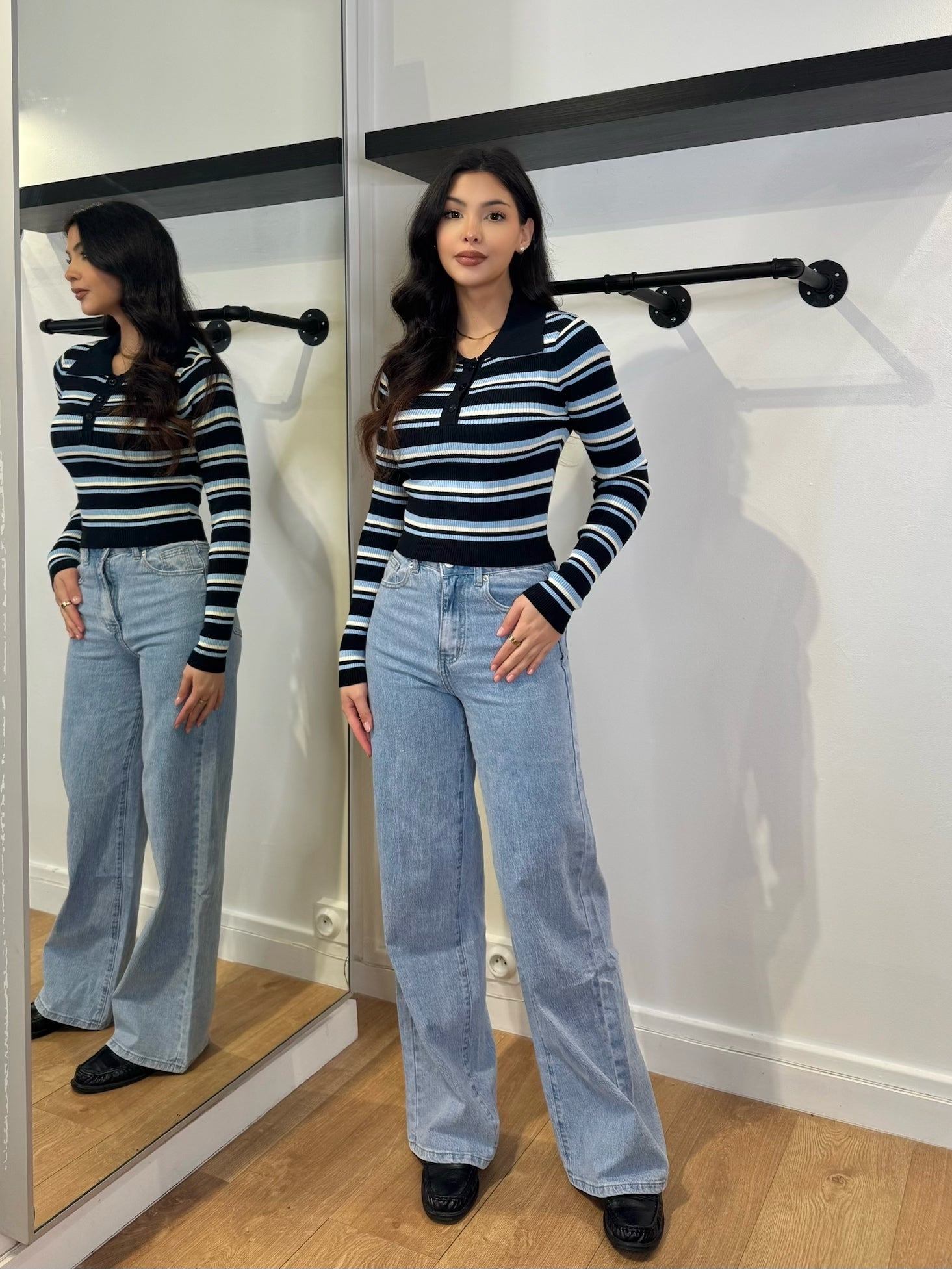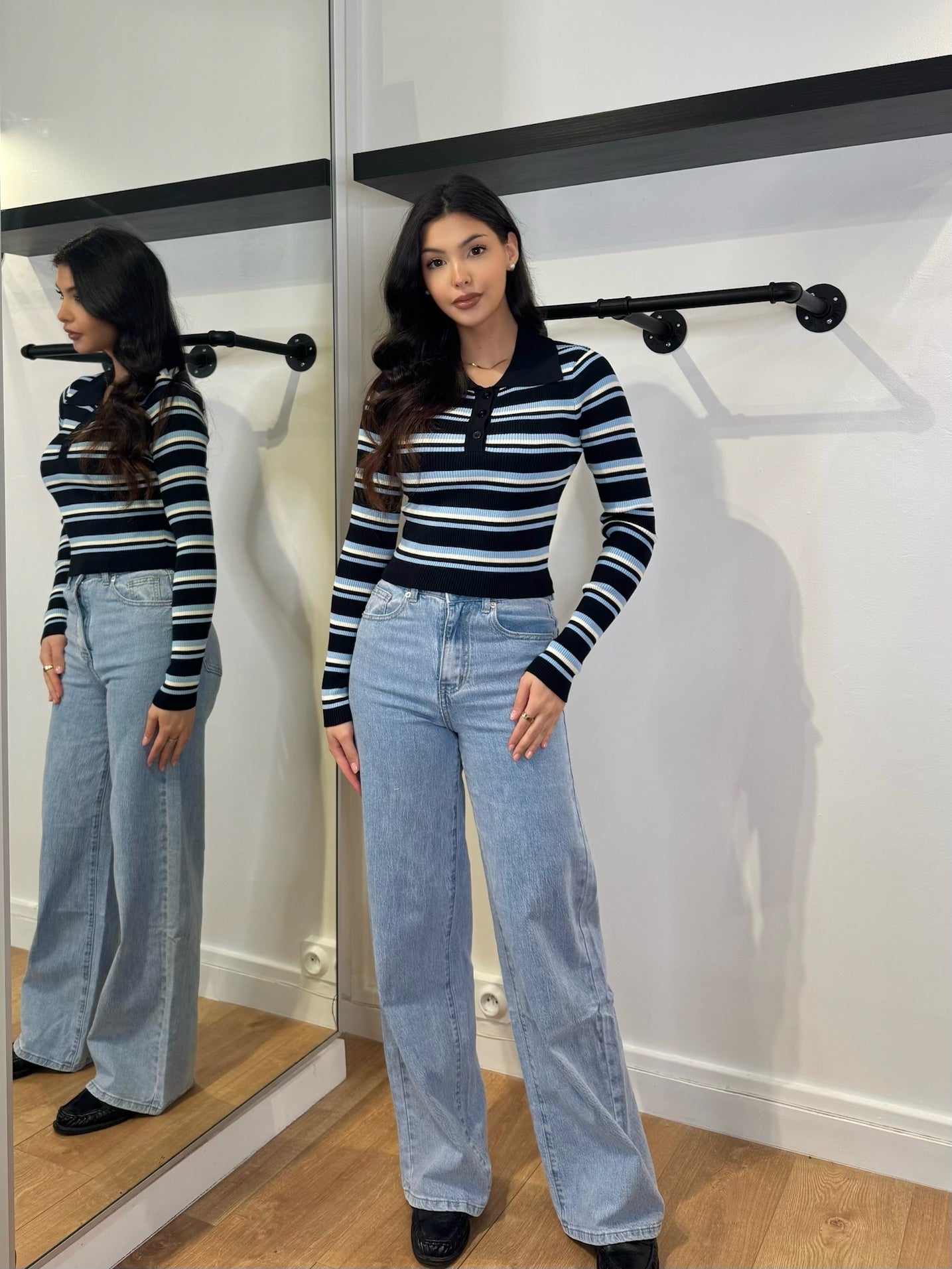 POLO MANCHE LONGUE NOIR/BLEU RAYÉ