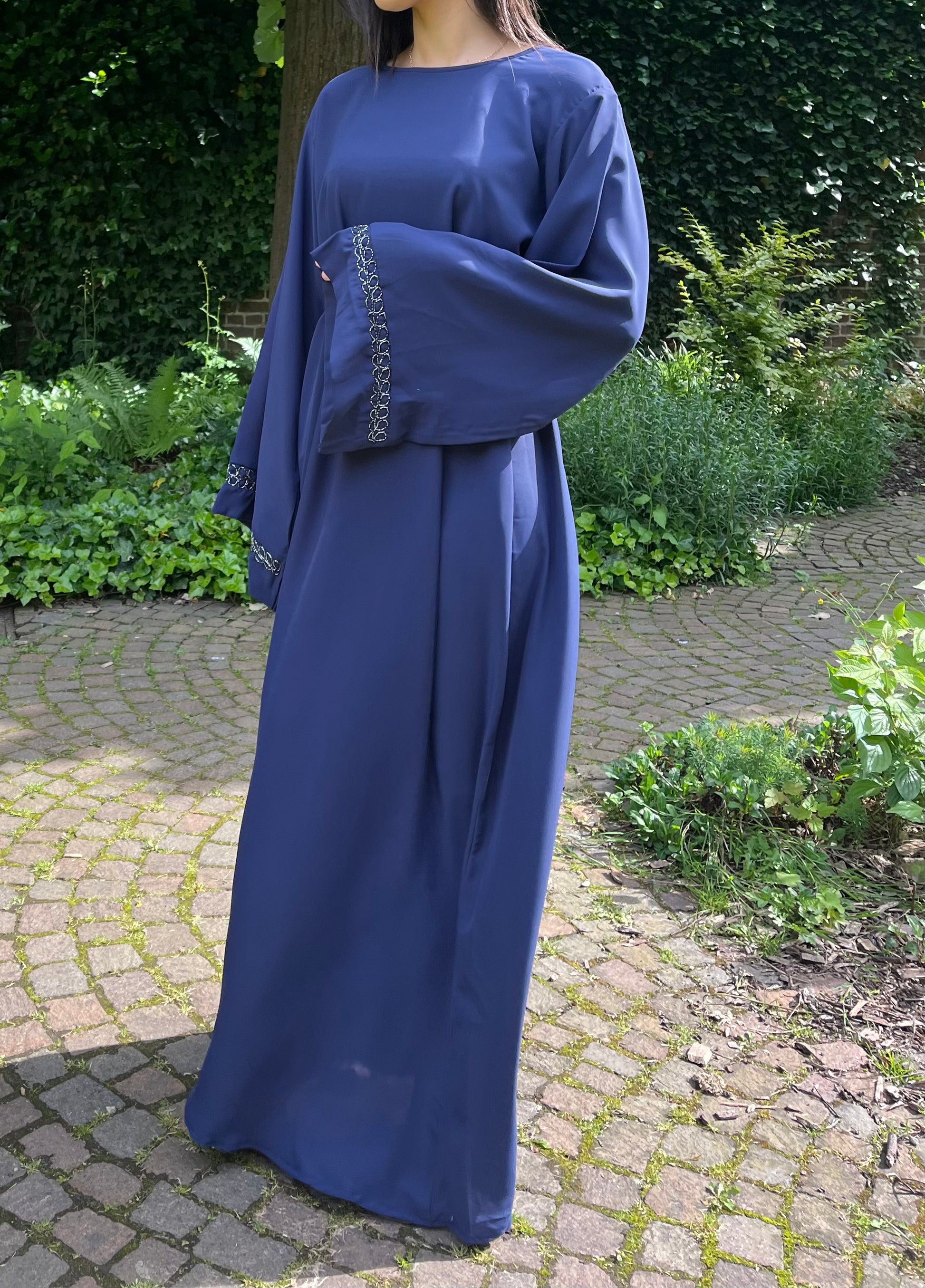 Longue et fluide, sa coupe épurée sublime naturellement la silhouette tout en conservant une élégance pudique et raffinée. Les détails couture aux manches ajoutent une touche structurée et sophistiquée, signature d’un véritable savoir-faire inspiré de Dubaï.